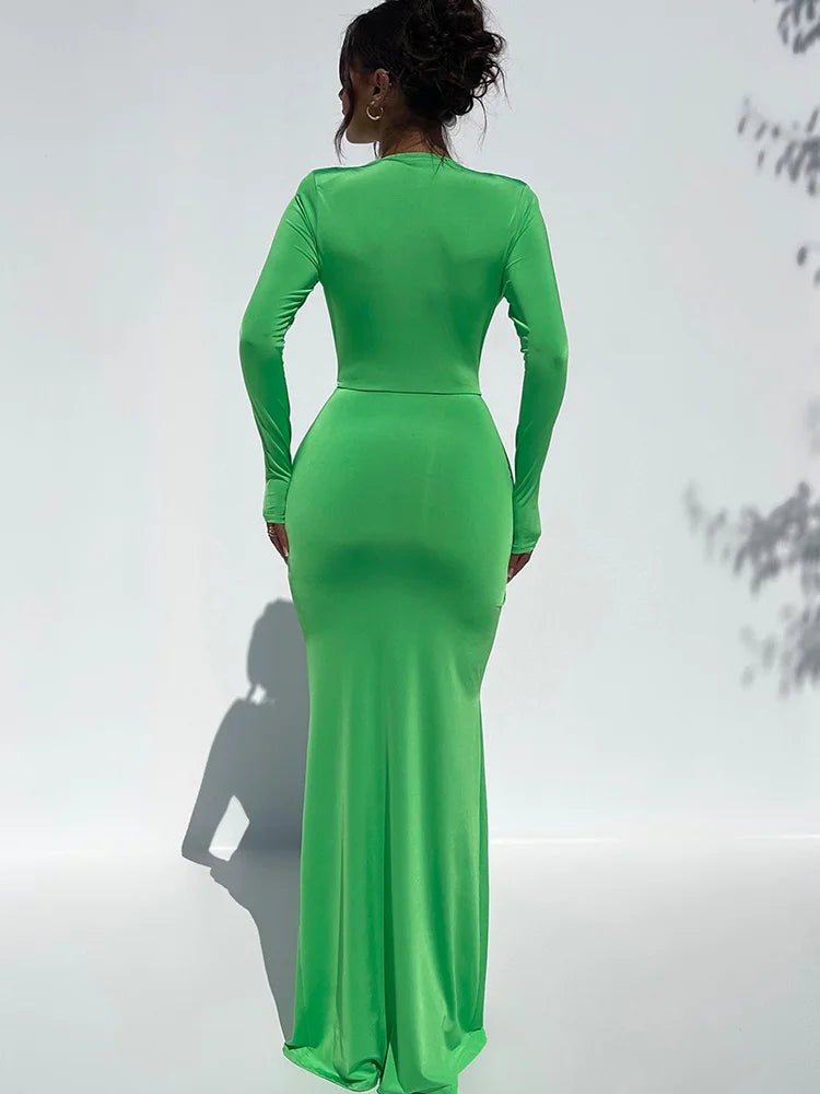 Der hohe Beinschlitz sorgt für eine moderne, verführerische Silhouette und maximale Bewegungsfreiheit. Die langen Ärmel schaffen einen edlen Ausgleich zum gewagten Ausschnitt und machen das Kleid perfekt für elegante Events, Partys, Galaabende oder exklusive Nacht-Outfits.
