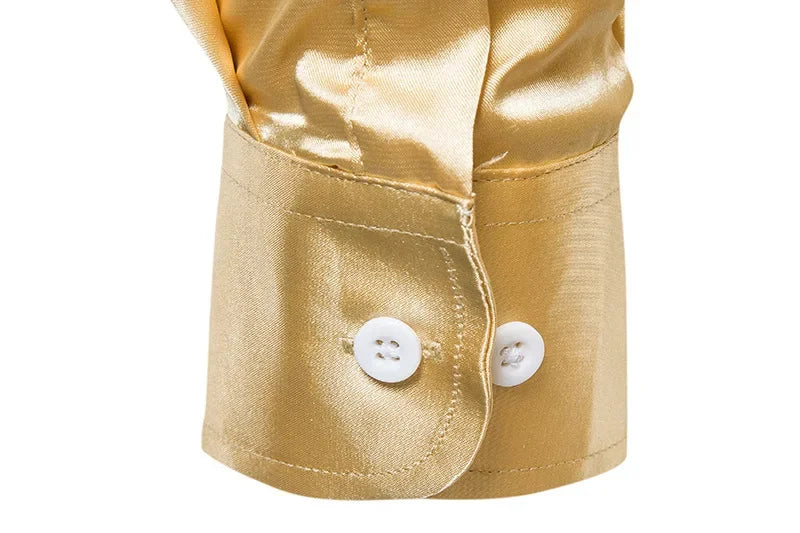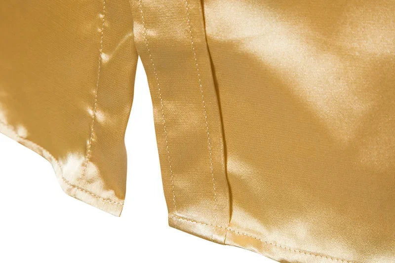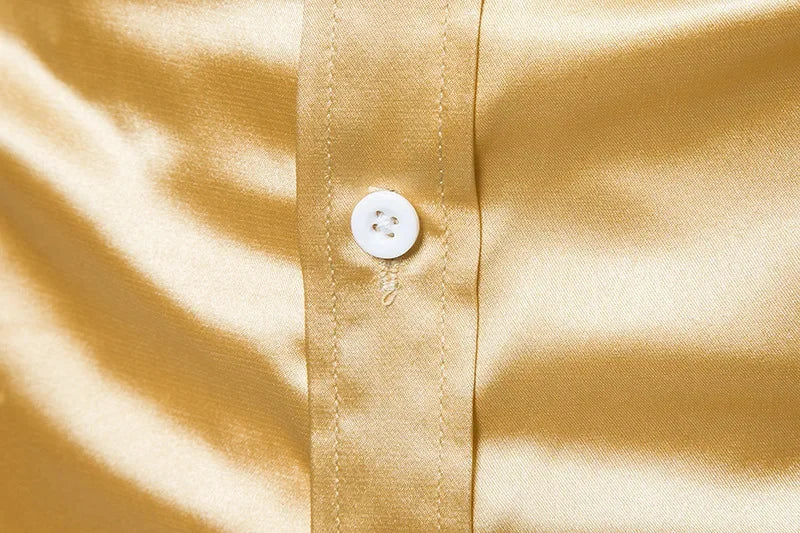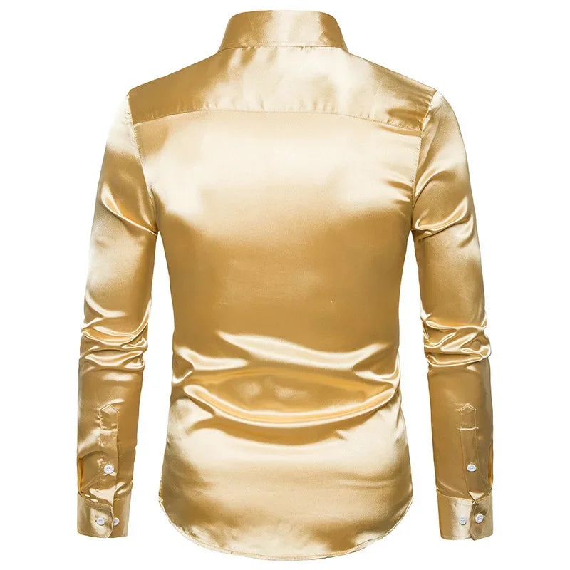 Der glatte Satin-Stoff fühlt sich kühl und weich auf der Haut an, die schmale Passform betont deine Silhouette, ohne die Bewegungsfreiheit einzuschränken. Klassischer Kragen, durchgehende Knopfleiste und dezent gestaltete Manschetten sorgen dafür, dass der Look trotz maximalem Glanz stilvoll bleibt. Kombiniert mit schwarzer Jeans oder Anzughose entsteht ein moderner, selbstbewusster Night-Out-Style.