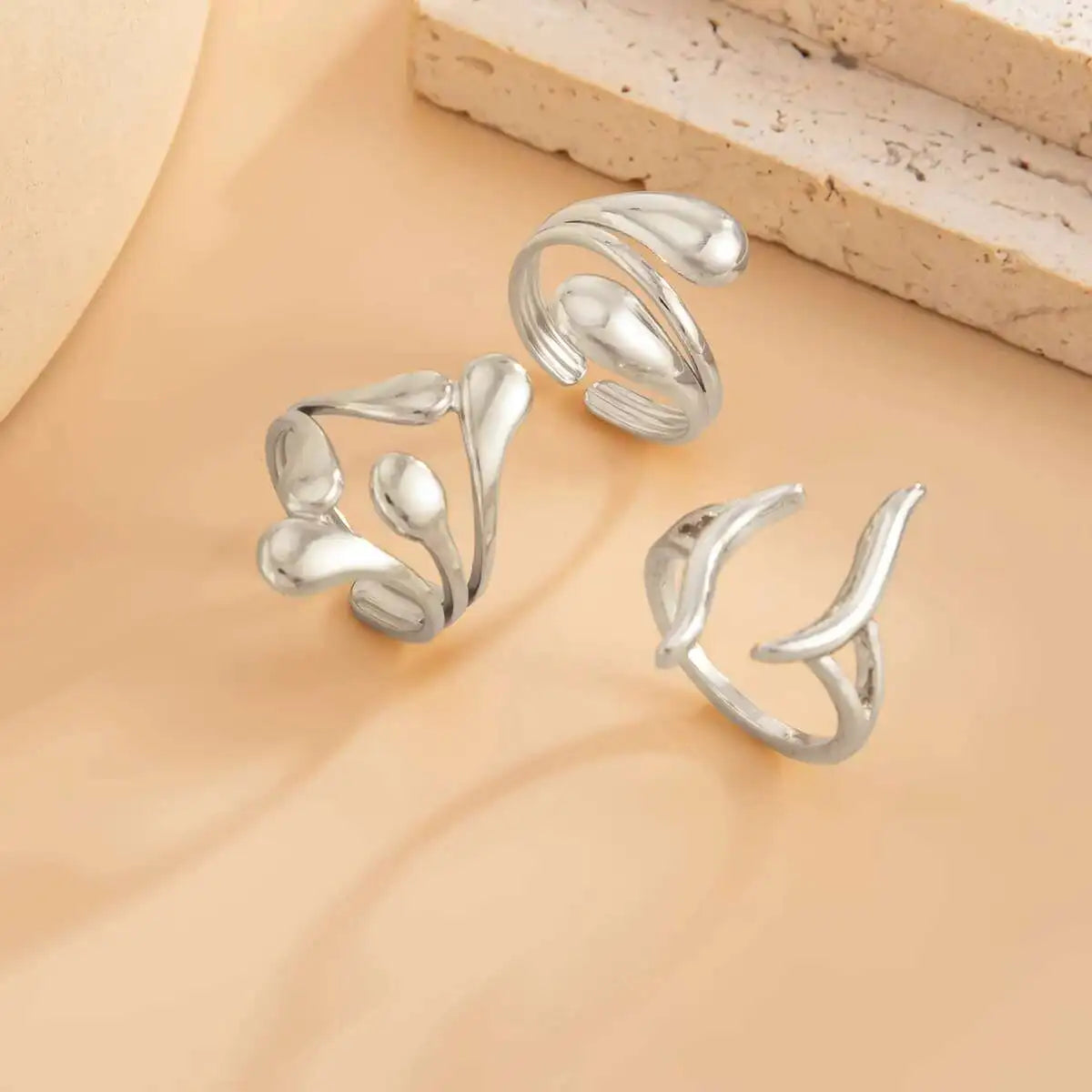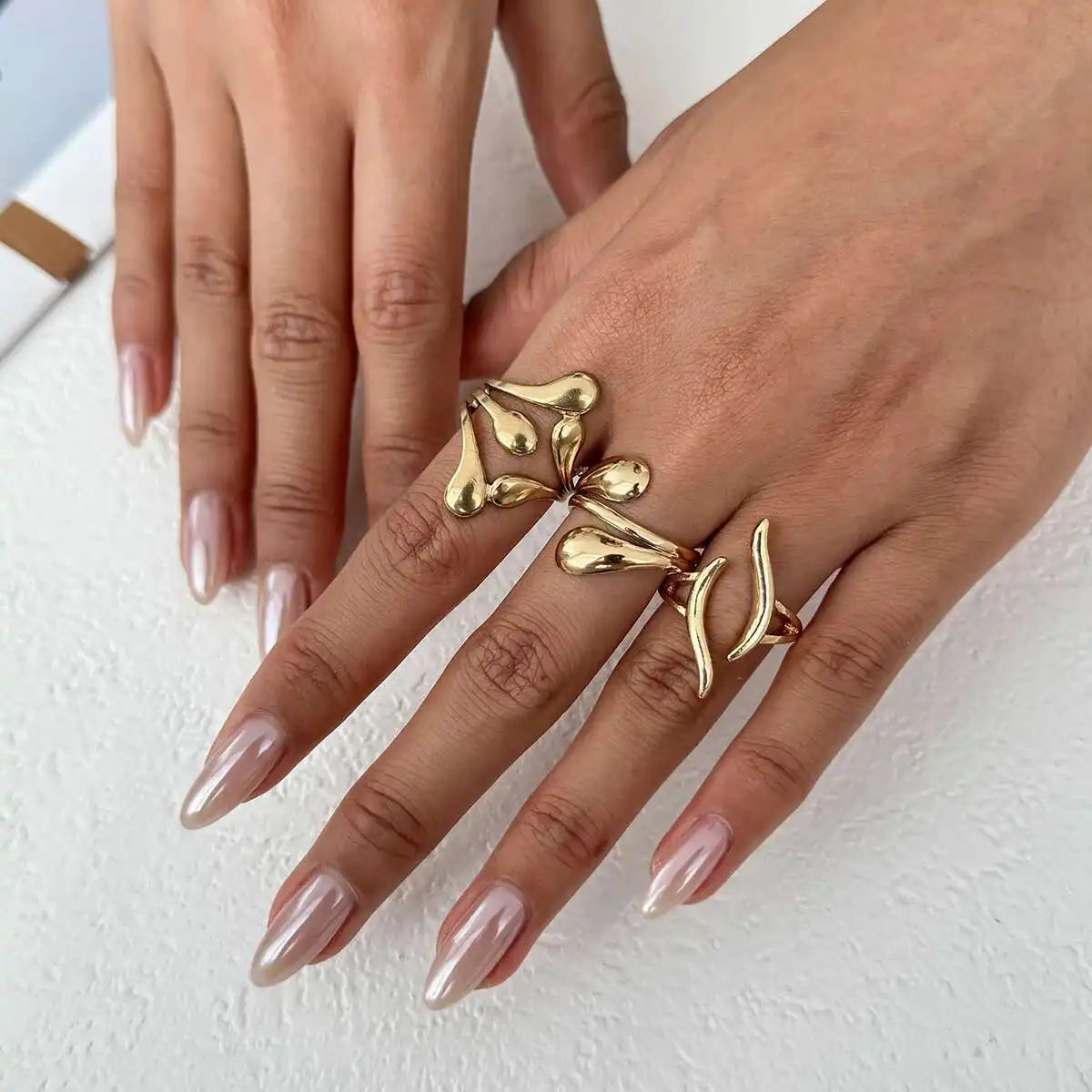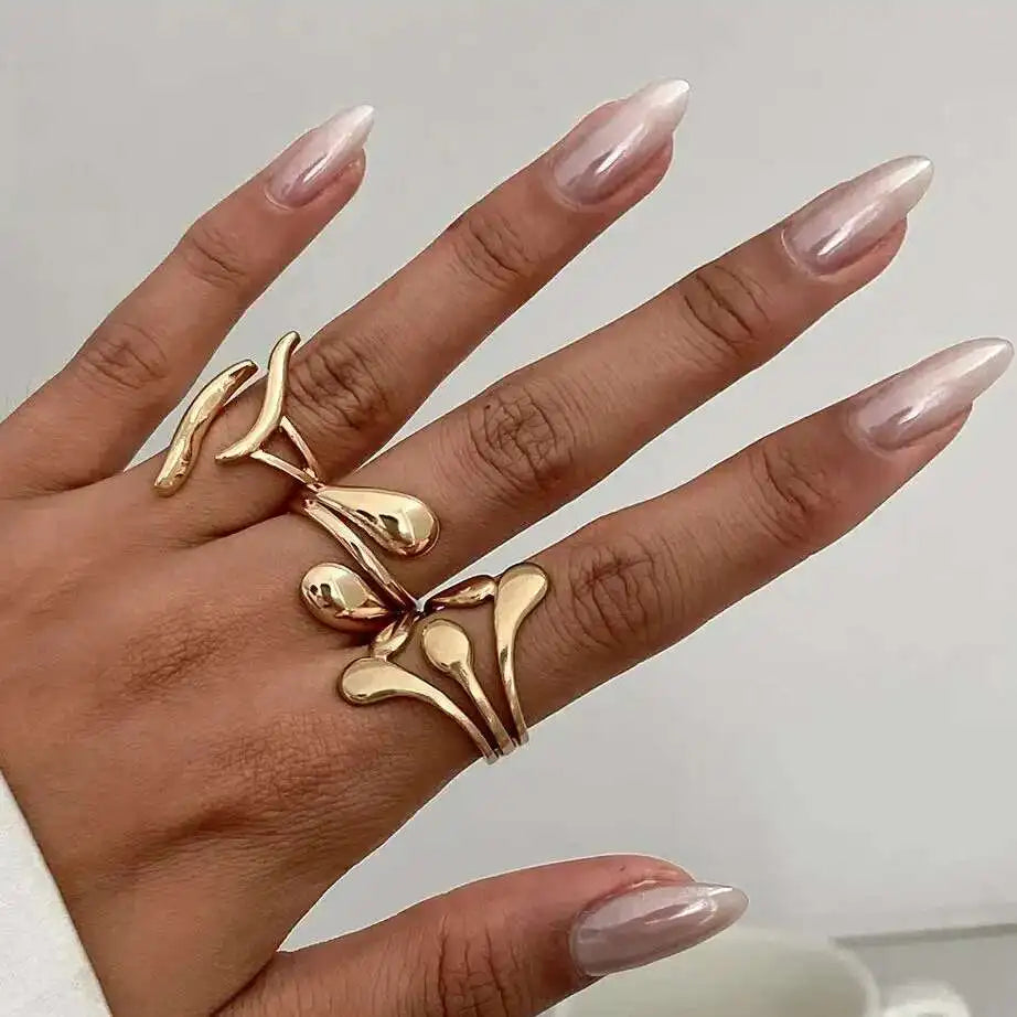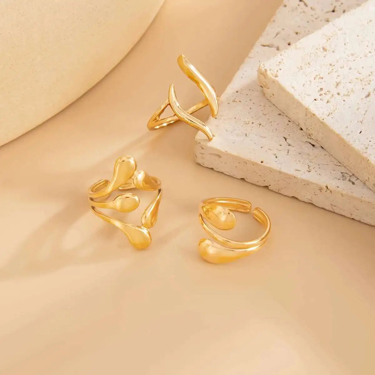 Die drei unterschiedlich geformten Ringe lassen sich perfekt kombinieren oder einzeln tragen. Jeder Ring ist aus hochwertiger Legierung gefertigt und mit einer glänzenden 18K-Vergoldung veredelt. Ein Must-Have für alle, die minimalistischen Luxus und avantgardistisches Design lieben.