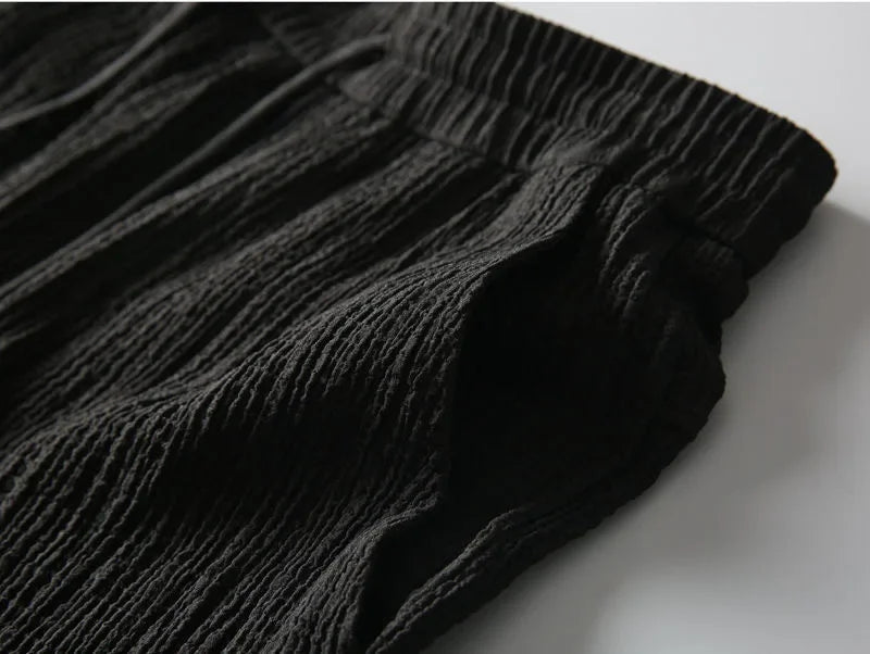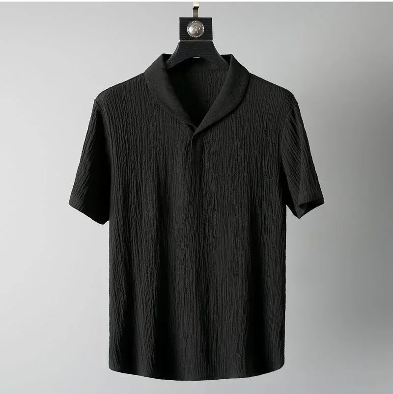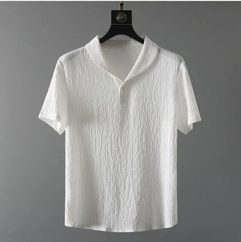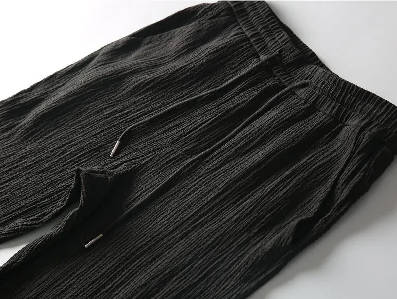 Das Set besteht aus einem kurzärmligen Shirt mit offenem V-Kragen und einer schlank geschnittenen Jogger-Hose – beide gefertigt aus hochwertigem, leicht texturiertem Stoff, der atmungsaktiv, weich und ideal für warme Tage ist.