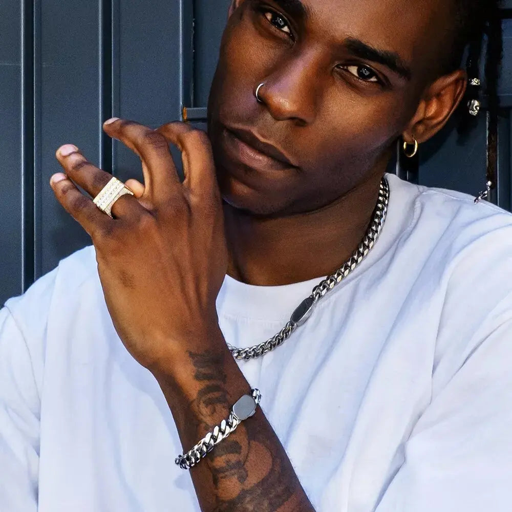 Das Warenbar „Titan Aureus Set“ vereint Stärke, Luxus und zeitlose Eleganz in einem exklusiven Schmuckduo. Die massive Cuban Link Kette und das passende Armband bestehen aus poliertem, goldbeschichtetem Edelstahl und überzeugen durch ihren kraftvollen, cleanen Look.